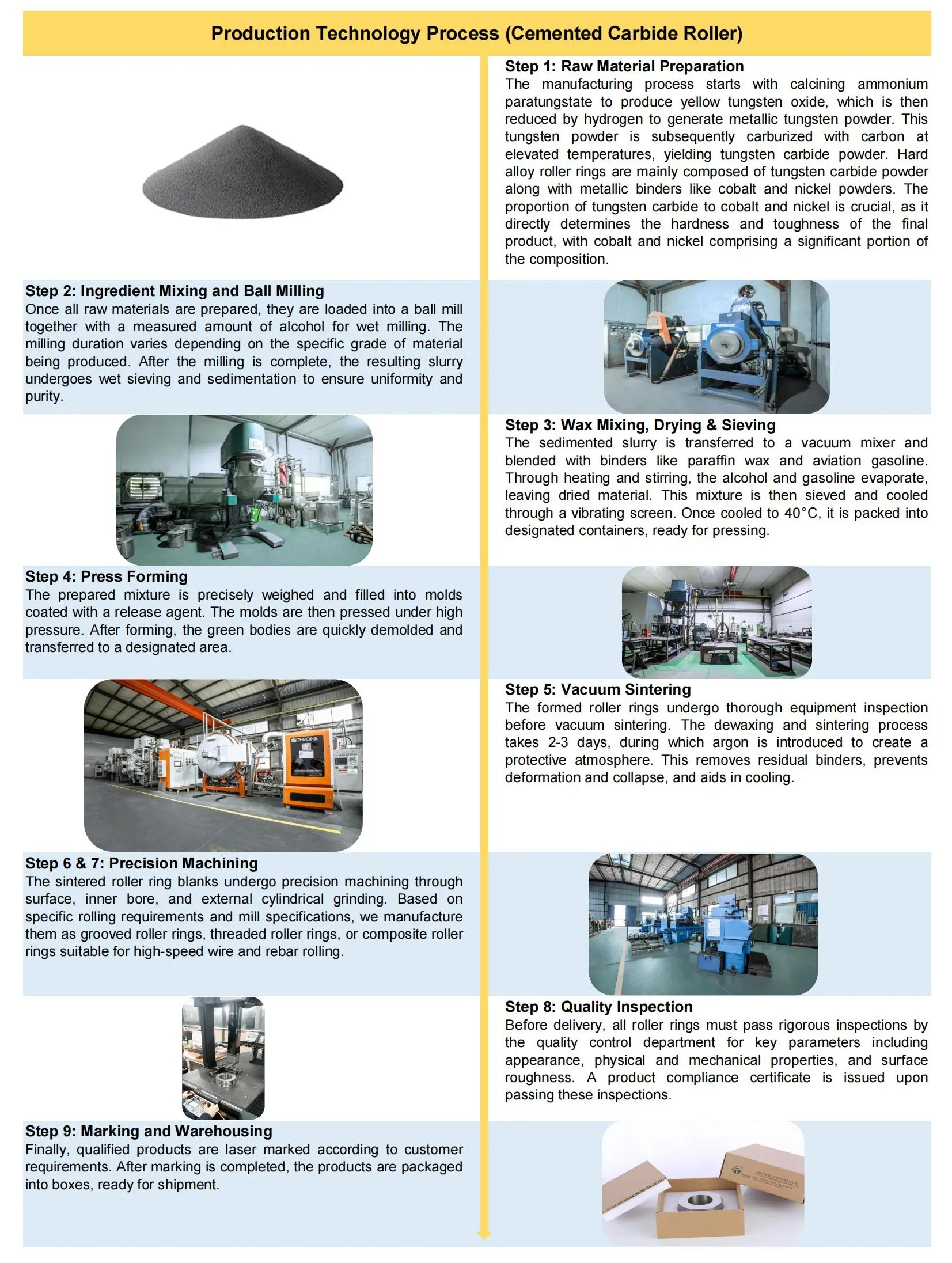 Cemented carbide roll rings (also known as Tungsten Carbide Roll Rings) provide excellent thermal conductivity and outperform first-generation cast iron and high-speed steel rolls in heat resistance, wear resistance, and strength, with minimal hardness reduction at high temperatures. Developed alongside high-speed wire rod mills, they are now extensively applied in the finishing stands for manufacturing high-speed wire, rebar, and deformed steel bars.